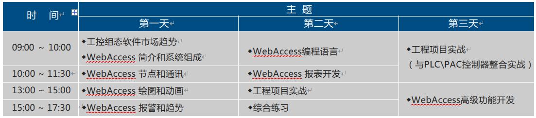 研华WebAccess是全国首家基于浏览器的网络化通用组态软件,用户可以通过IE浏览器进行远程监控和维护,其强大的远程诊断维护功能在物联网需求中越来越重要。作为研华在各个行业深耕的基础平台软件,WebAccess完全满足客户的实际应用需求,并通过图形化界面完美展示,通过该课程设置,学员可以在最短的时间了解该软件的架构,并通过实际设备操作,掌握自行开发专案的能力,架构属于自己的应用环境。通过该高级培训,学员可以快速掌握WebAccess的基本功能,并熟练使用WebAccess平台开发工程所需功能,完成自动化项目中的上位开发。并且通过高级培训,学员可以轻松获得更多软件的特色功能,比如FLASH 、OCX嵌入等。
